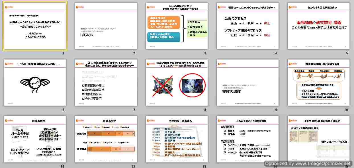 1日目のパネルディスカッションはKaienの会社を説明する資料を既に用意したのだが、二日目の資料がなかなか作れていなかった。職業トレーニングについてどのようにプレゼンしたら、みなさんに分かりやすくなるのか、ちょっと判らなかったからだ。きょうは午前中の2時間を活用したら、あら不思議。結構上手に仕上がりました!!