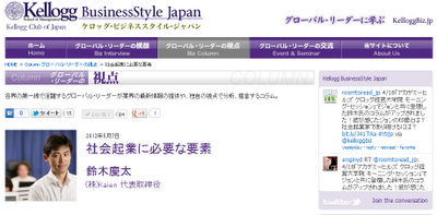 ケロッグビズスタイルというウェブサイトでコラムを書かせてもらった。タイトルは「社会起業に必要な要素」。ちょっとビターなテイストのコラムなのだが、ありがたいことに4回シリーズの中では一番読んでいただけたようだ。RTやいいねなどしていただいた方に感謝。